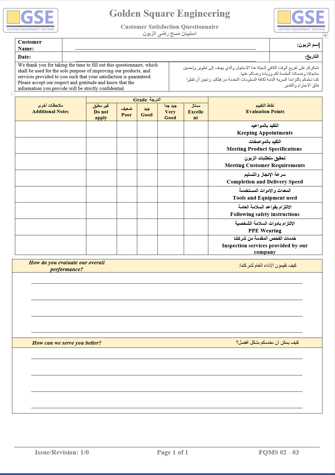 Please fill the customer satisfaction questionnaire below